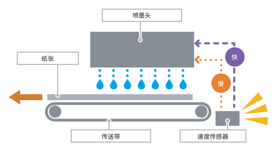 速度传感器可检测传送带的微小速度变化,并自动调整排墨频率以匹配传送带的速度。这项技术可确保纸上的网点位置准确,从而在没有色偏的情况下实现出色的图像质量和色彩一致性。