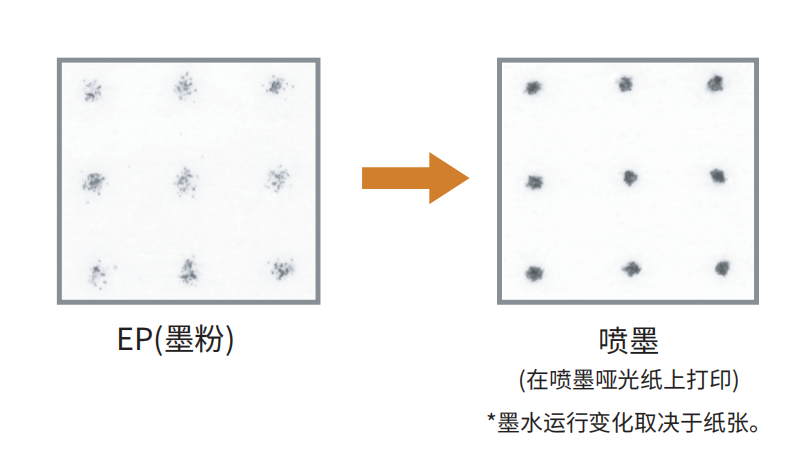 与喷墨相比由于激光打印网点直径较大和打印的不精确性,碳粉打印机的网点再现相对较粗糙。喷墨技术可提供较小的网点,能够实现文本、细线和渐变色的出色再现。由于其色调再现曲线,喷墨打印还可以实现比静电成像更平滑的色彩再现。