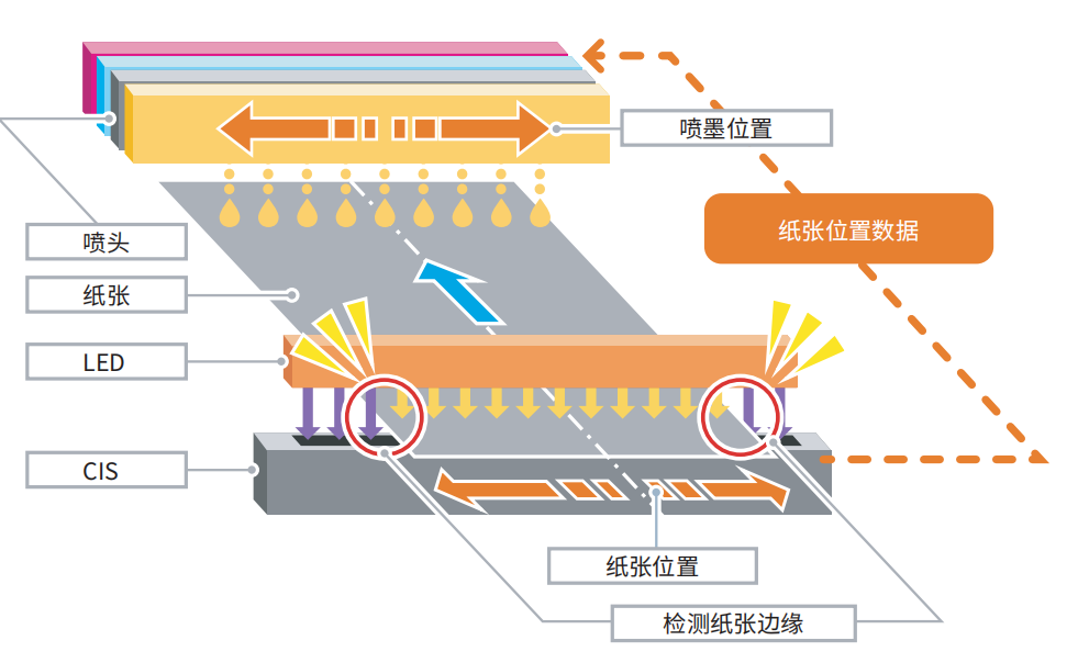 CIS可检测打孔的形状、尺寸和位置。它会自动遮蔽图像数据,确保仅在介质上排墨。此系统还可为折叠的介质遮蔽图像数据,确保系统运行。